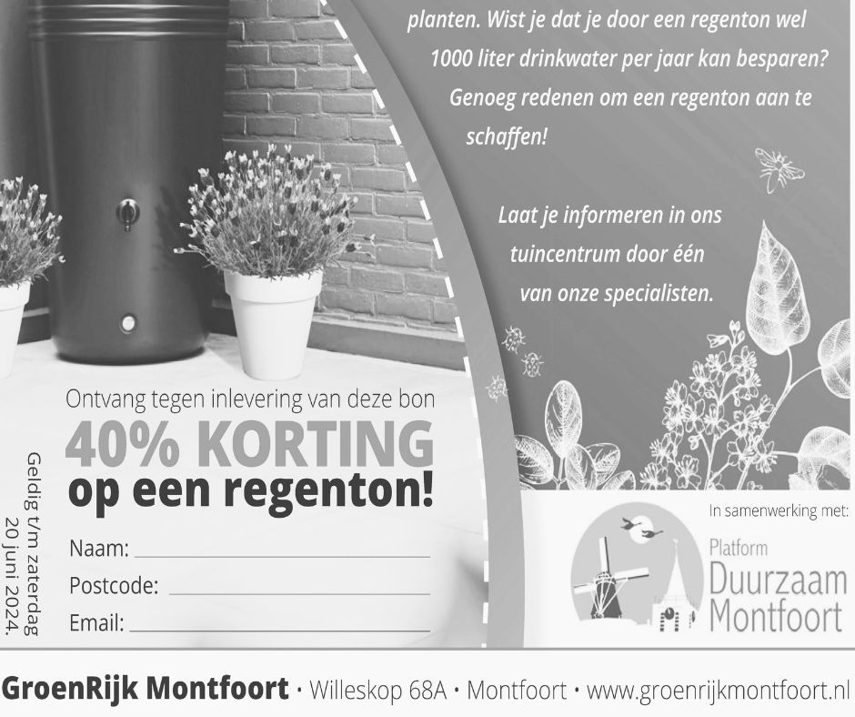 Ga naar GroenRijk Montfoort, vul de voucher in en kies jouw regenton uit. Laat je informeren door een medewerker van het tuincentrum voor alle mogelijkheden.